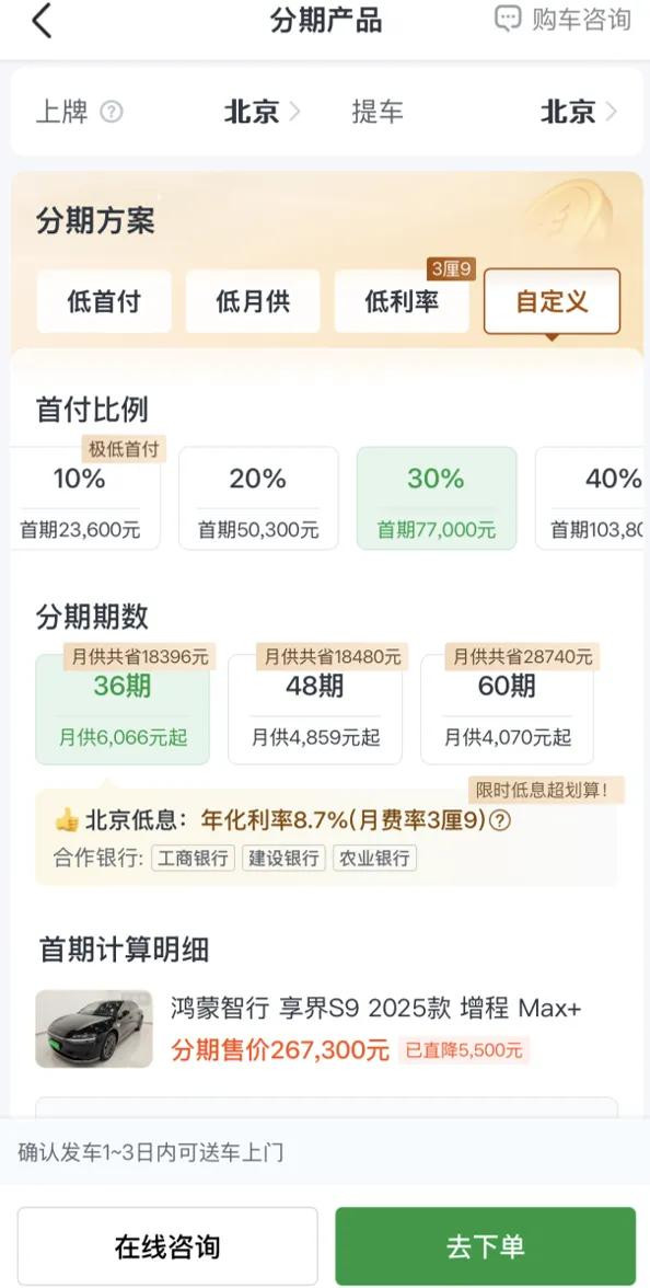其中,分期购车业务主打低门槛与高额度,最低可至1成首付,最高贷款额度达50万元,月费率低至3厘9(折合年化约4.68%)。